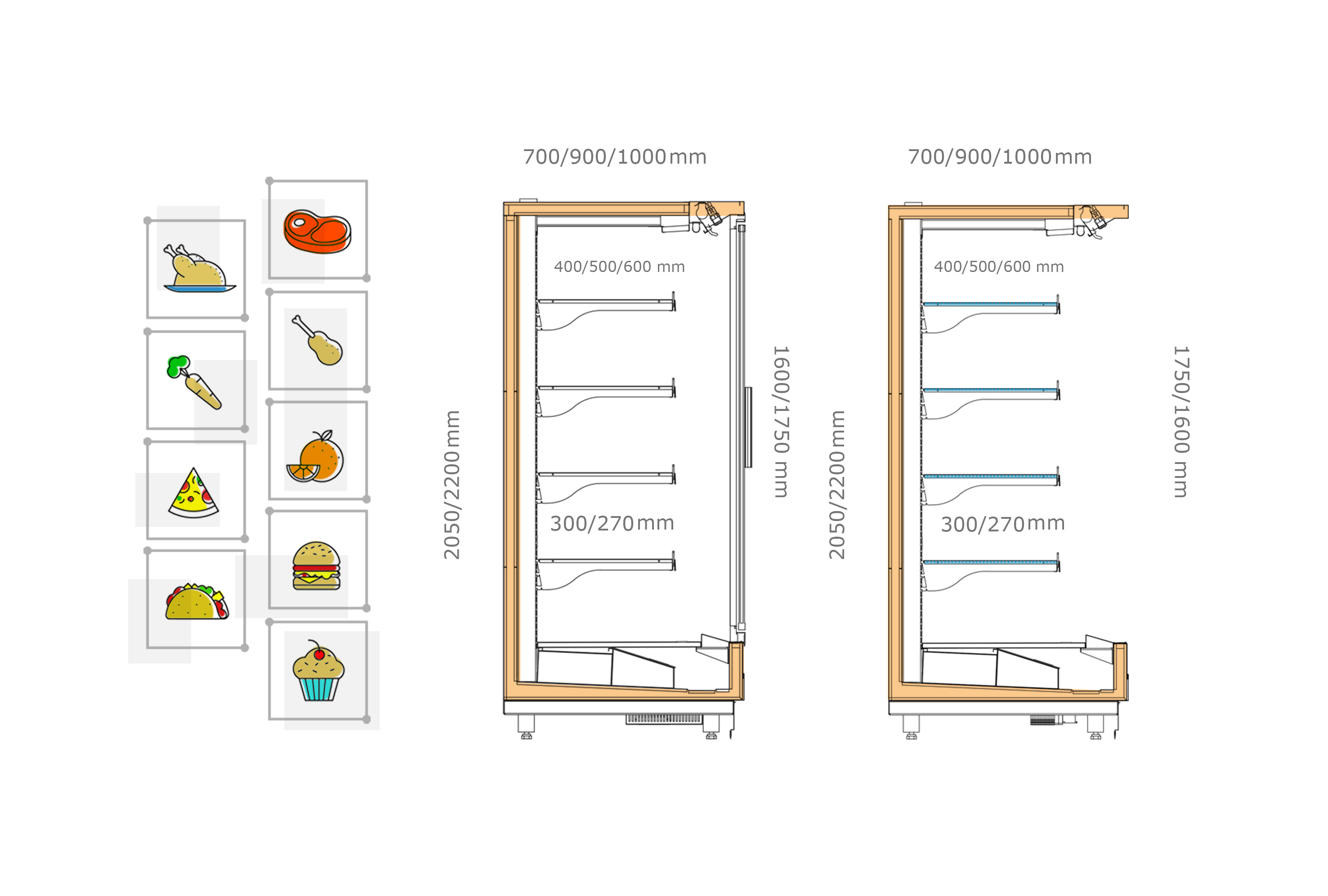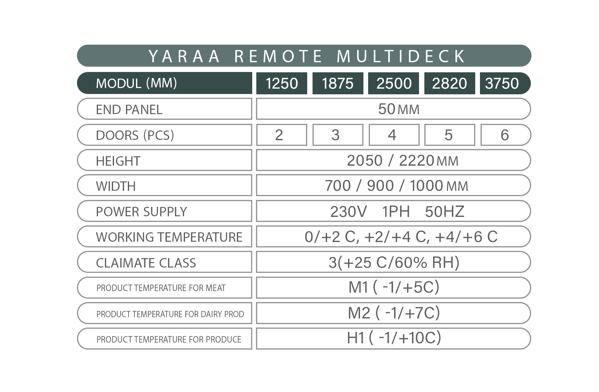 For the refrigerated display of milk and equivalent products, packaged meat products and greengrocer products, in 3 different widths (700 mm, 900 mm, 1000 mm), 2050 and 2200 mm with two different 4+1 and 5+1 shelves, With its stylish design in 1250 mm, 1875 mm, 2500 mm, 2820 mm and 3750 mm lengths, you can sell your refrigerated product displays with YARAA at all retail points, large and small.
